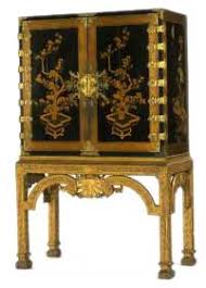 Other cabinets were japanned, to imitate lacquer, or were covered in patterned gesso to create a raised and gilded appearance. Now reproduction furniture, Chests on stands were replaced by bureau cabinets, often topped with pediments or domes intended for the display of expensive porcelain. Clothes presses and livery cupboards were commonplace, as were chests of drawers and kneehole desks.