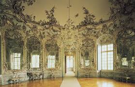The magnificent centrepiece of the Amalienburg , the mirror room, is ringed by ornately framed silver-gilt mirrors and lit by elaborate chandeliers. The pale bluish-green walls enhance the feeling of delicacy and light and provide a perfect backdrop to extensive silver stucco decoration. A closer look at the applied design work reveals an array of Rococo motifs and scenes - naturalistic birds fly above asymmetrical floral swags hanging from borders of cherubs, lyres, and scrolling leaves. Expansive panelled mirrors, framed by shells and S-curved, reflect and multiply the overall effect of movement and vivacity. This room would have been used for entertaining, including banqueting and lavish celebrations.